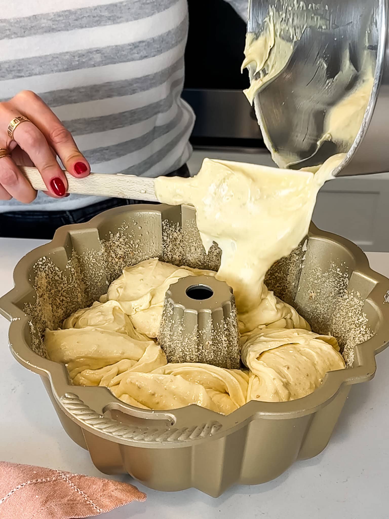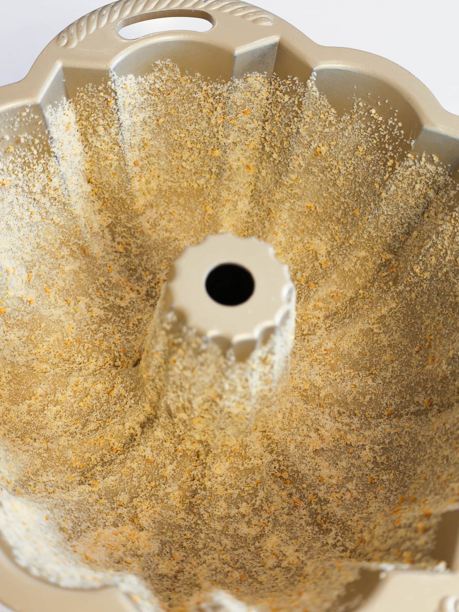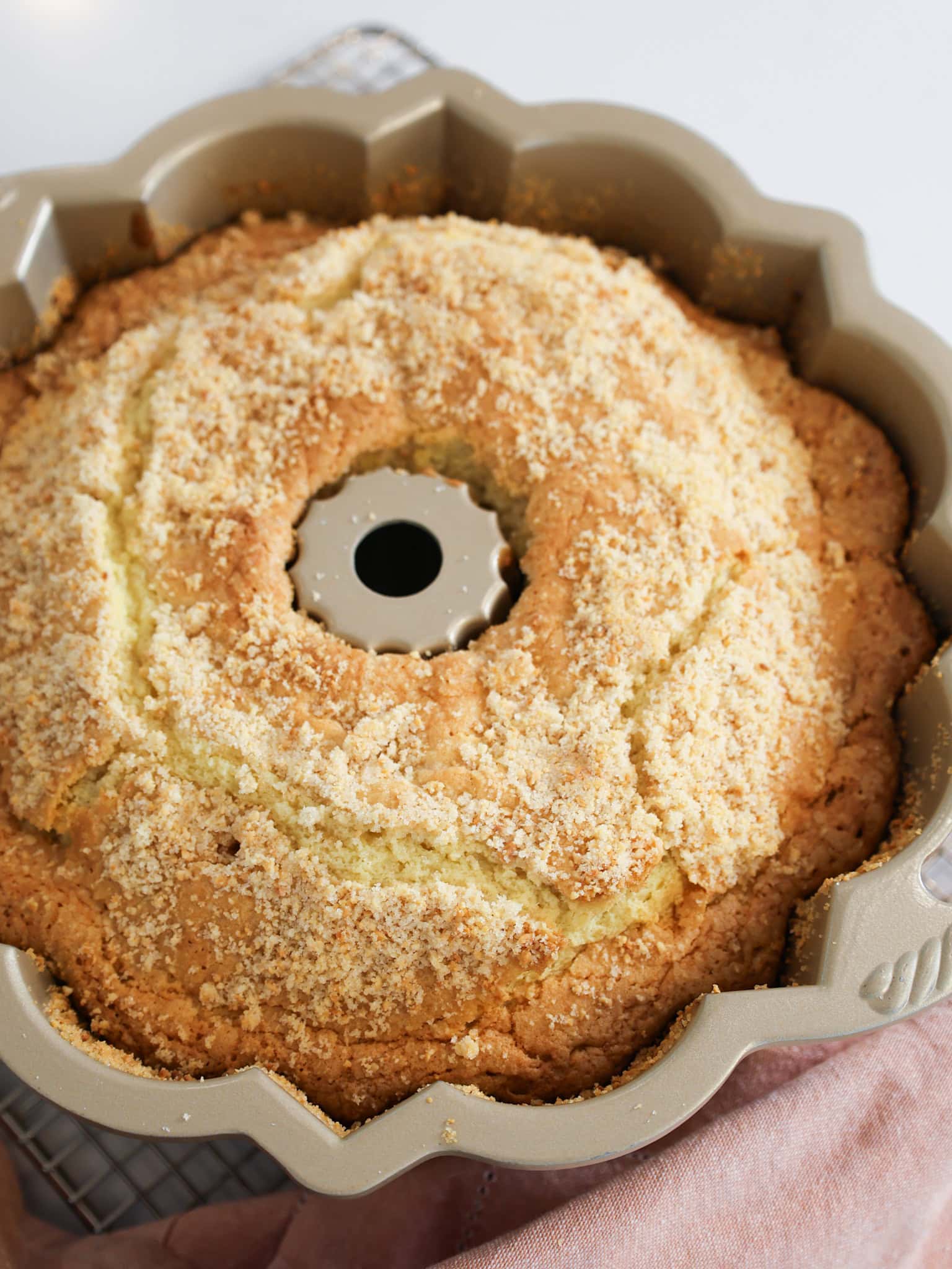 - Crisp outer crust: Something that makes this cake unique is that it's baked with a toasted almond-sugar mixture that forms a sweet, crisp outer crust. It's truly delightful AND makes cake removal extra easy.
