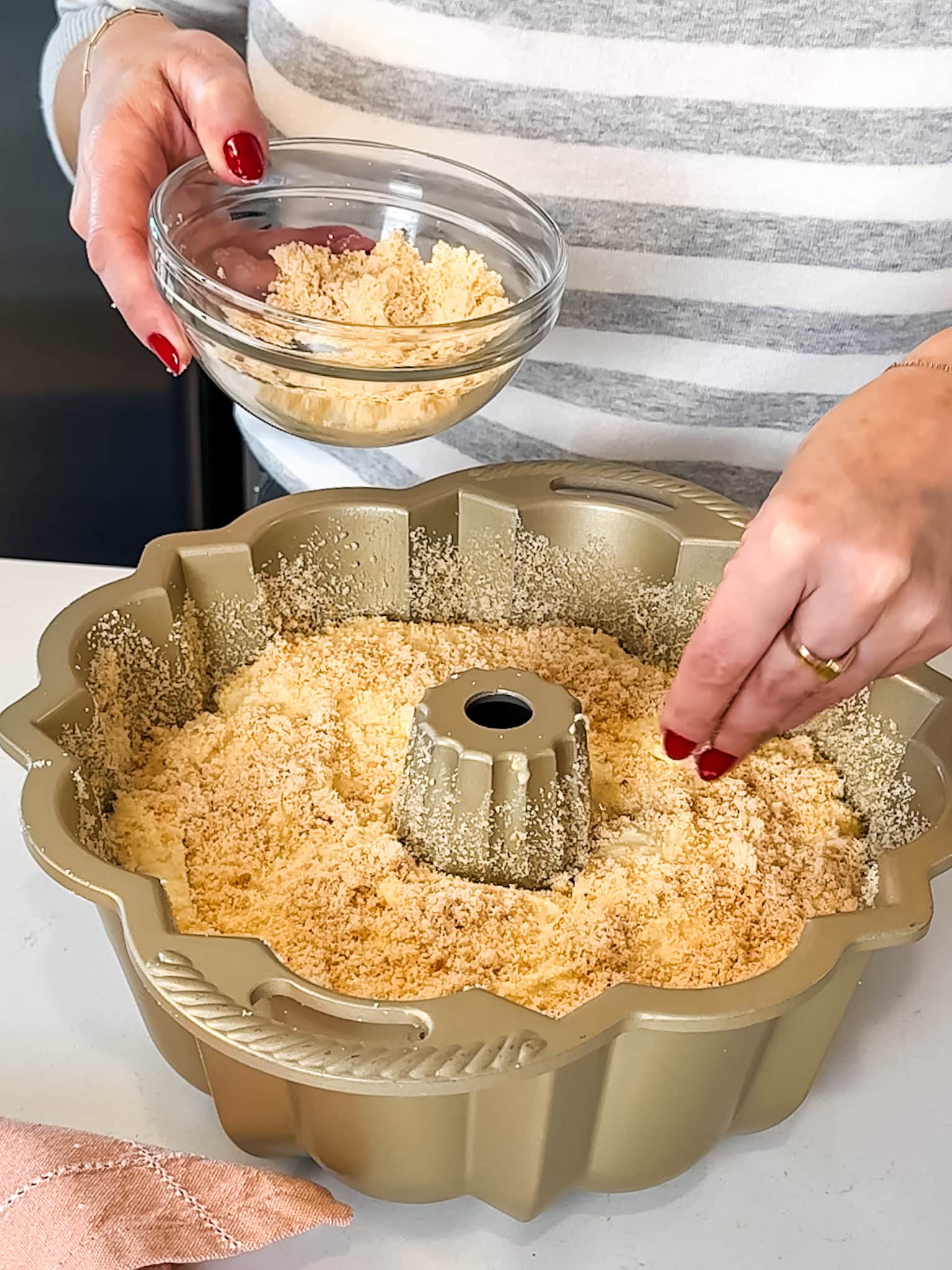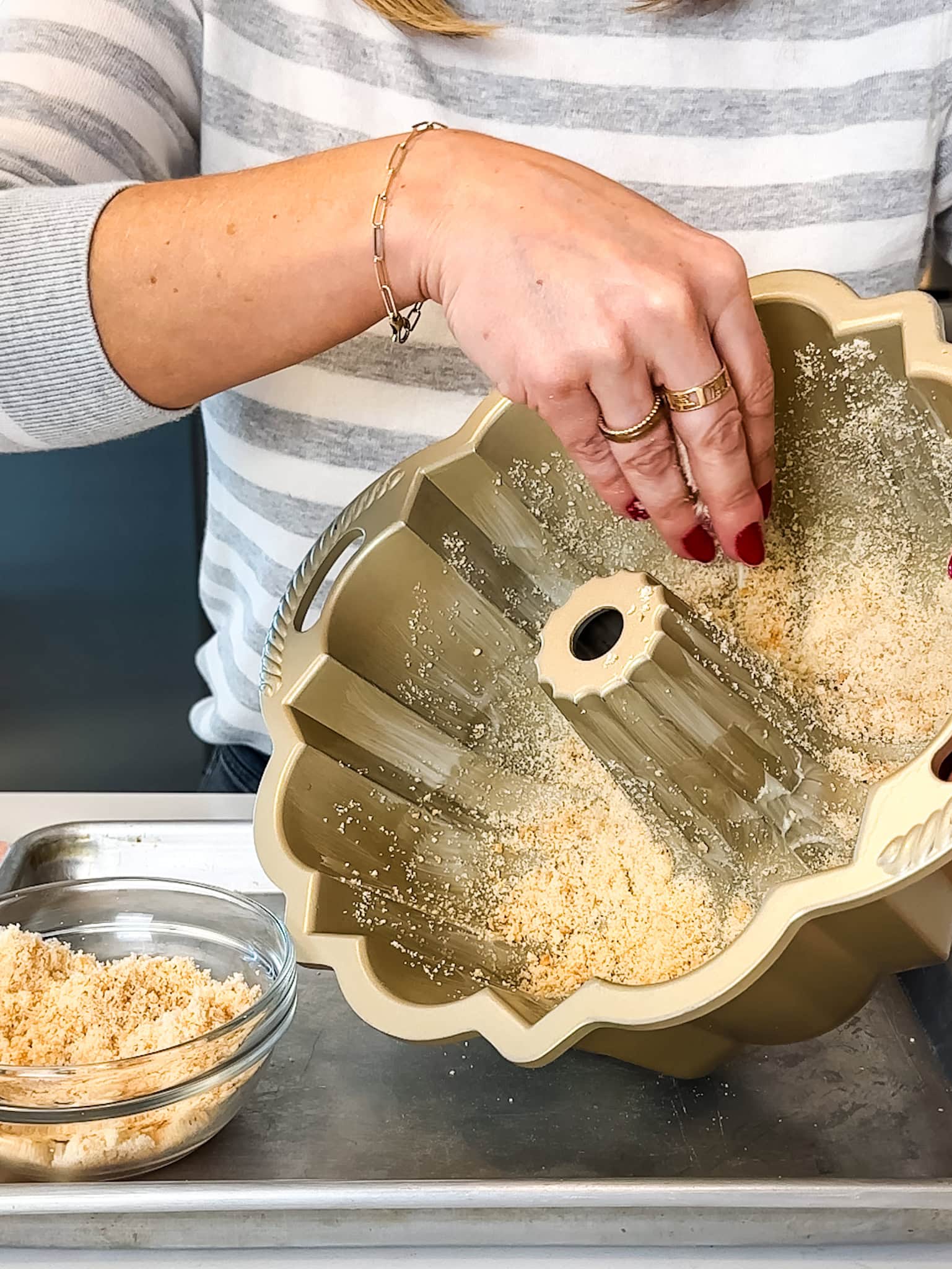 - Generously butter an 8-to-10 cup Bundt pan. Use the sugar-almond mixture to coat the inside of the pan, gently tapping any excess out and reserving it.