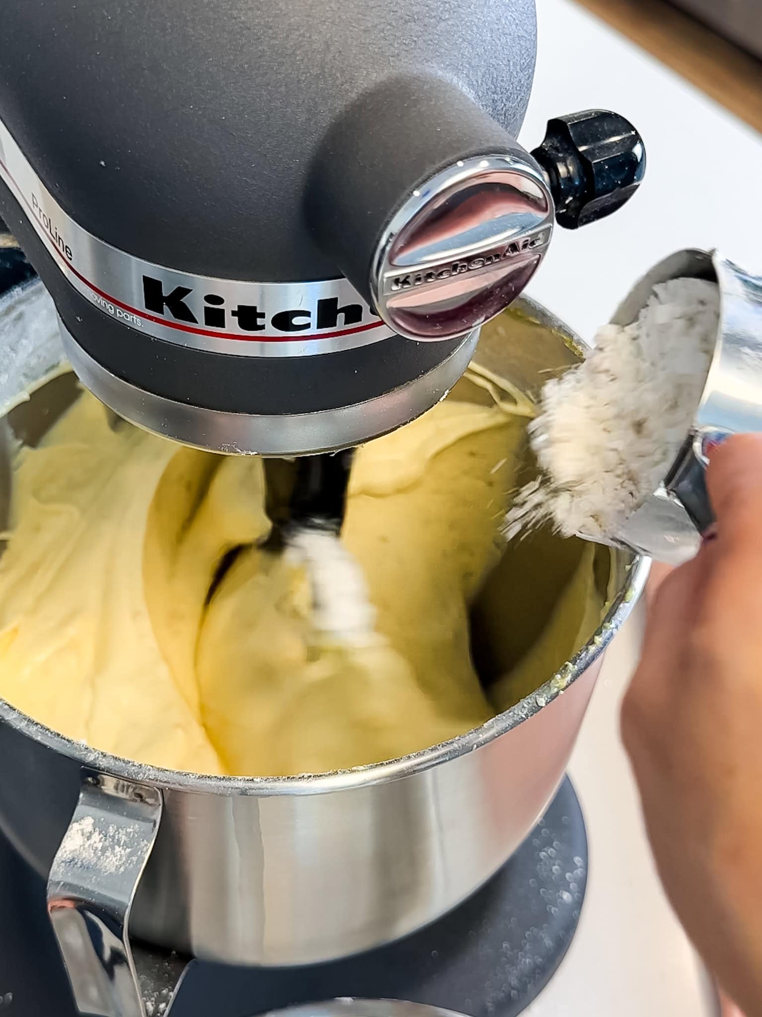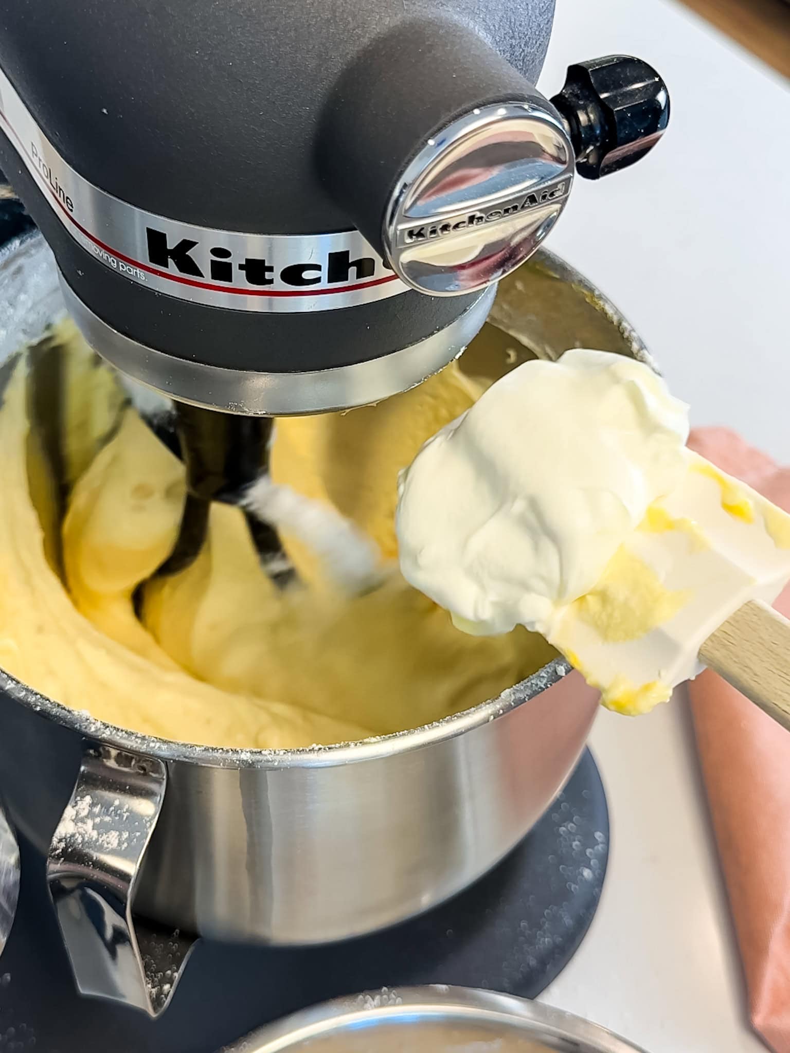 - Add the flour mixture and sour cream alternately in 3 batches, starting and ending with flour. Beat mixture until fully combined and use a spatula to scrape the sides and bottom of bowl to evenly mix batter.