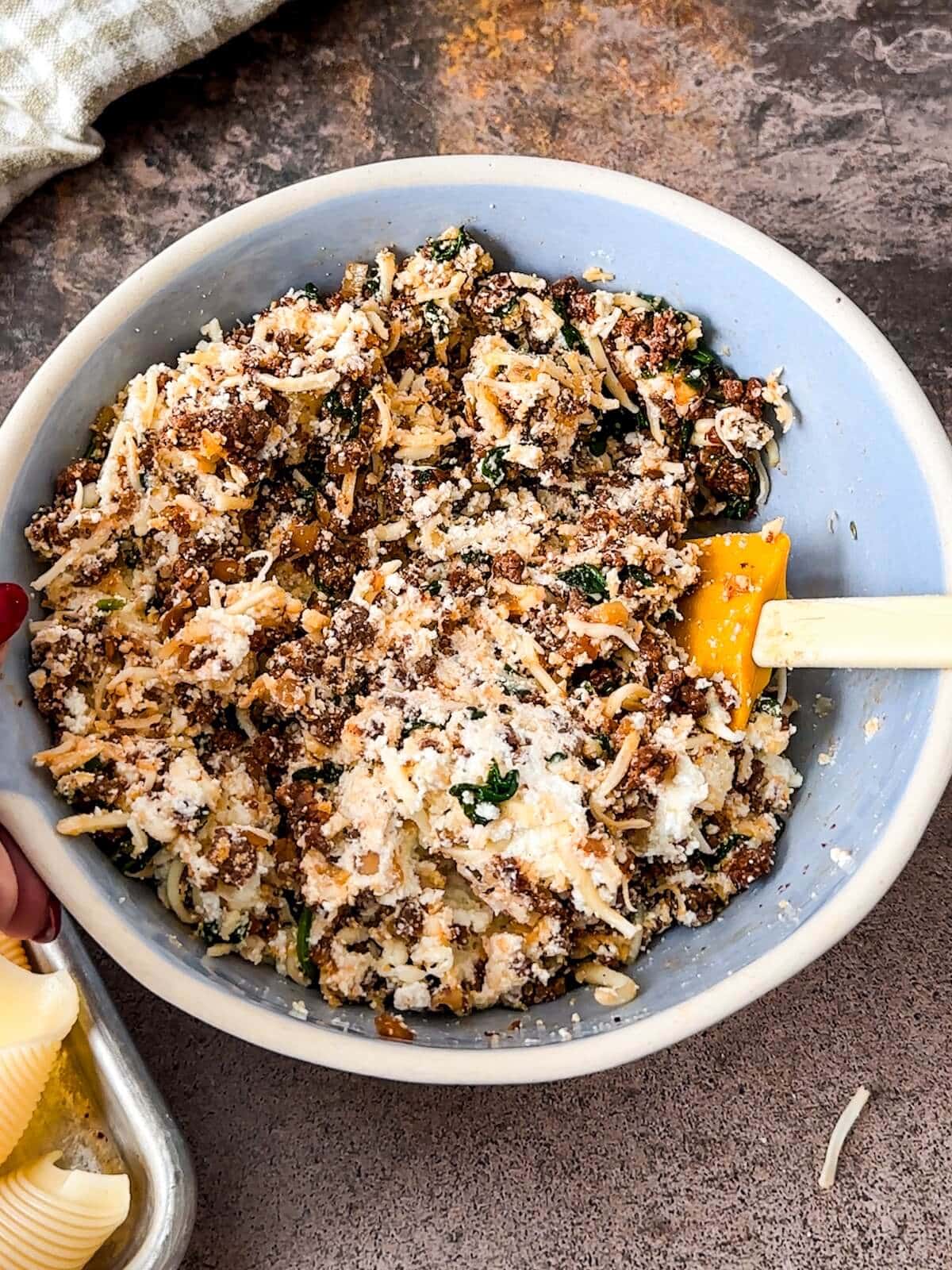 - Step 6: In a mixing bowl, stir together the cooled meat mixture, 1 cup of mozzarella, Parmesan, and ricotta cheese until well combined.