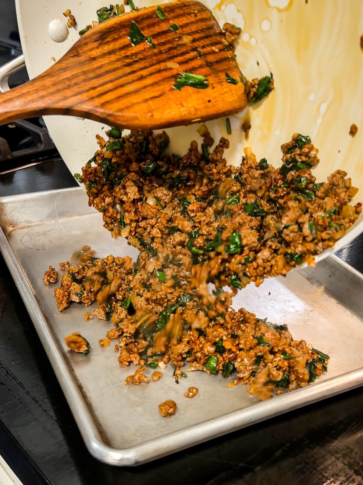 - Step 5: Take the meat mixture from the heat and spread it onto a baking sheet to quickly cool.