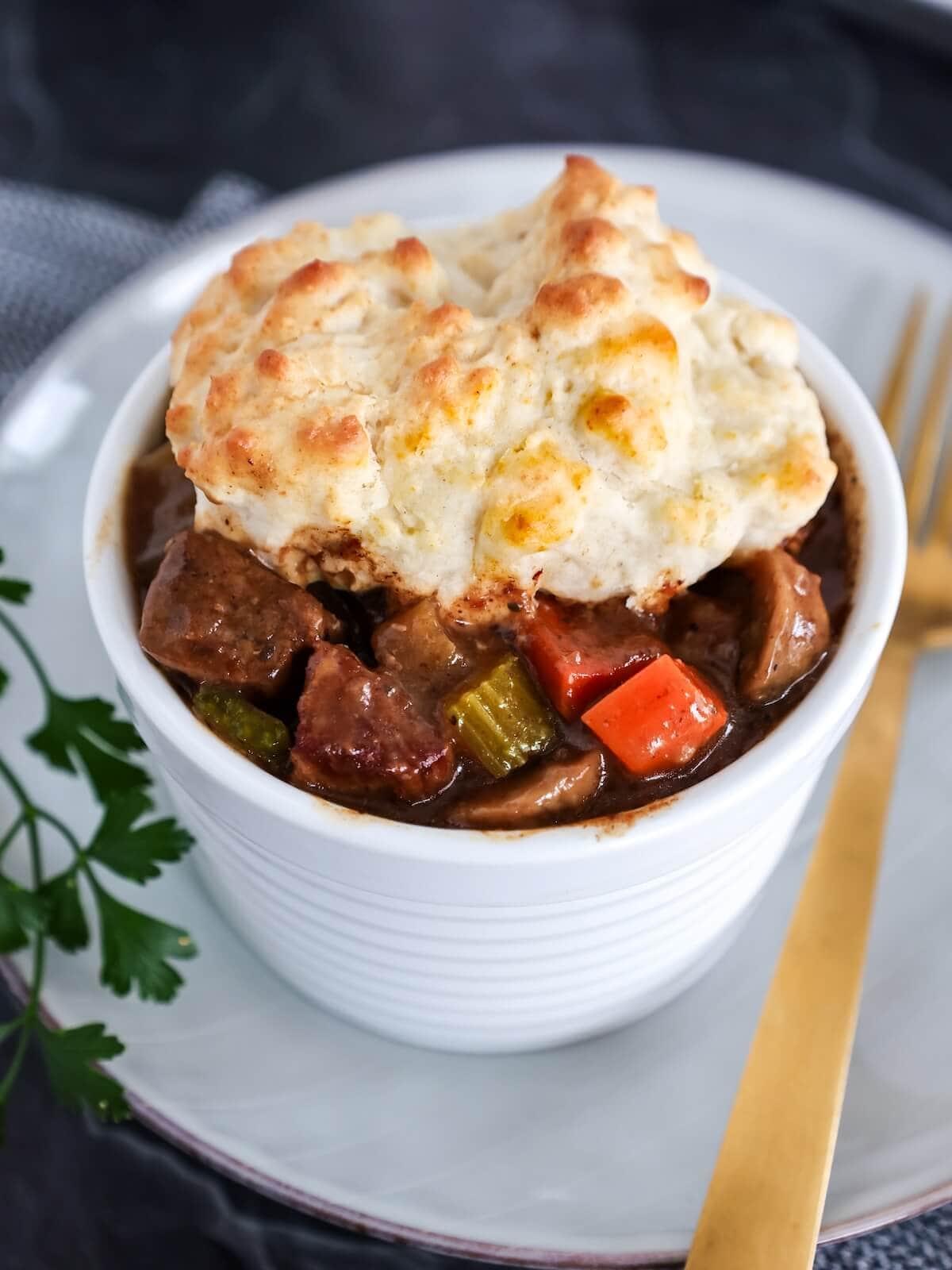 If you want to make individual servings use these cute mini Dutch ovens. They are just so sweet! Simply transfer the cooked stew to the individual containers before topping with biscuit dough. (Tastes the same by the way, wink wink).