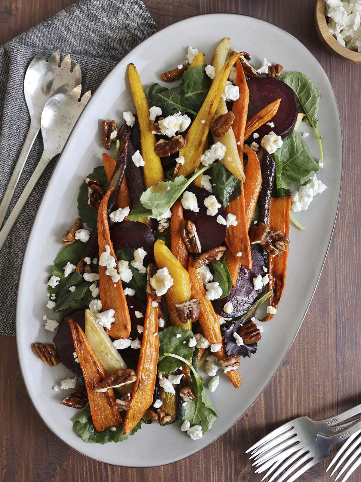 - When carrots are done, arrange on a platter with the beets and kale. Drizzle with remaining dressing and top with candied pecans and crumbled goat cheese.