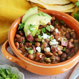 Charro Beans, also known as Frijoles Charros, are an easy-to-make Mexican side dish made with pinto beans, bacon, and ham. The beans are well-seasoned with an assortment of spices resulting in a smokey, savory side or main dish that pairs well with all your favorite Mexican dishes.