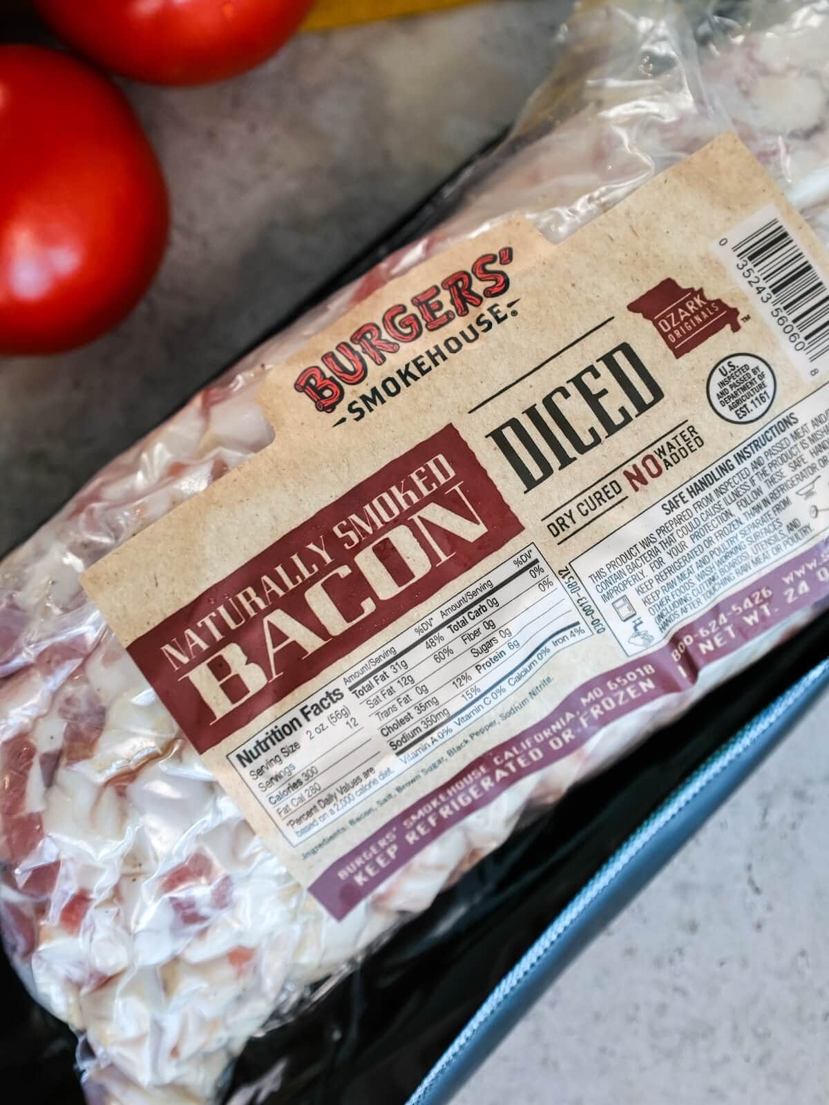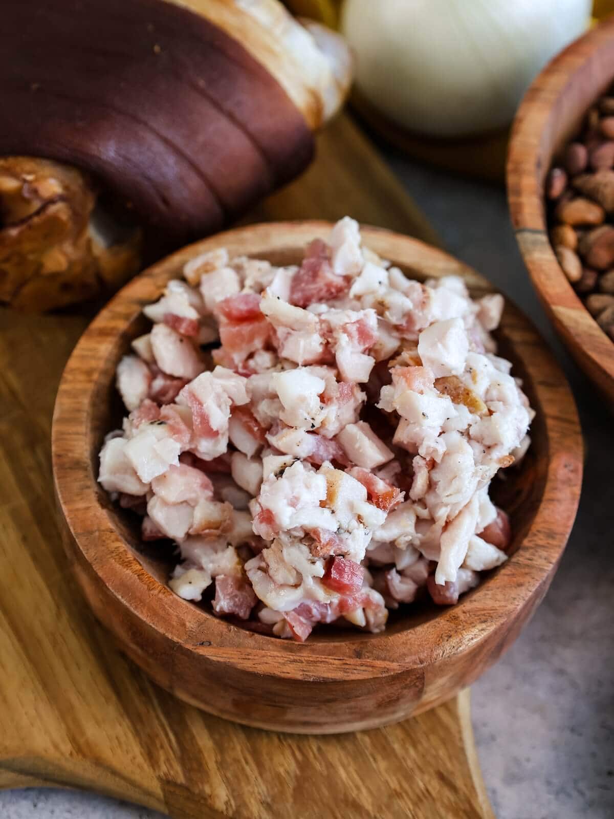 - Dry-cured chopped bacon: Because it is not brine-cured, this bacon is super flavorful and meaty. If you can't find it at the store, use thick cut bacon and chop it by hand. See bacon images below.